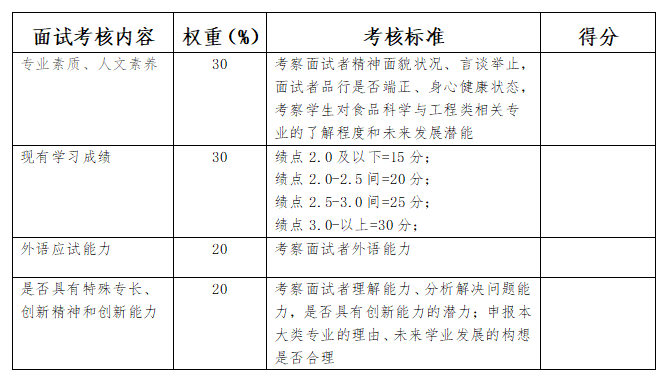 公司拟采用面试的考核方式。2023级和2024级同学将集中组织面试。面试考核成绩满分为100分,具体分配如下: