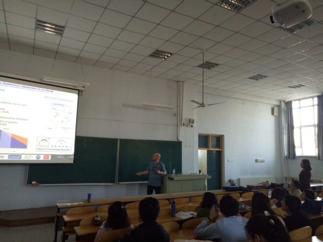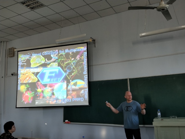 报告开始后,Hildebrandt教授首先向大家介绍了巴黎第十一大学的主要概况和科研团队力量等情况。其次,详细介绍了他的课题研究内容,包括时间分辨和时间门控FRET,镧系元素/染料/量子点之间的FRET用于光谱和时间多路发光检测的特定优势,及其在不同均相单步FRET生物传感器中的最新应用:灵敏和特异性检测来自低体积液体样品、细胞膜或细胞内部的多种生物标记物。