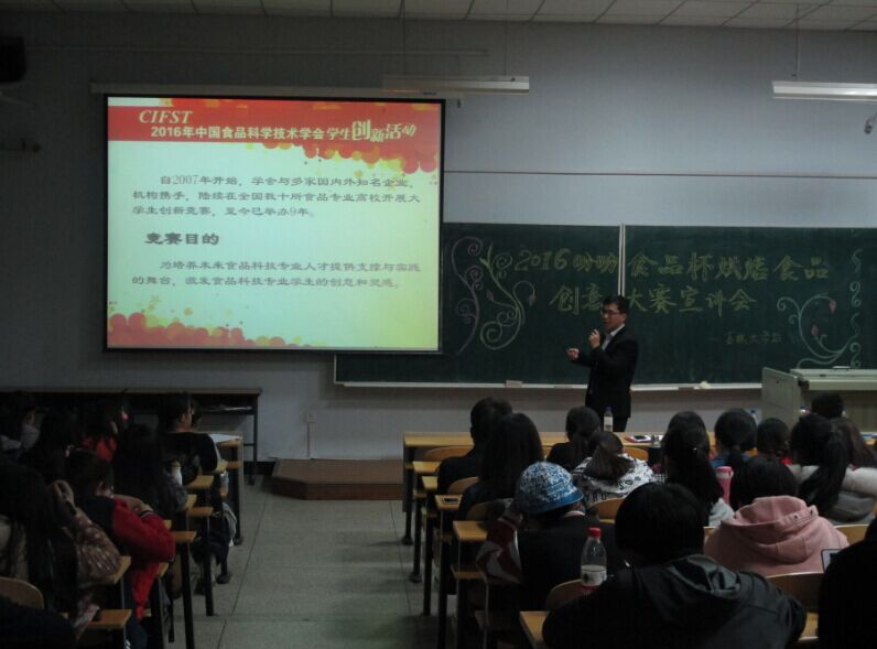 | 为弘扬专业特色,倡导美好生活,激发食品专业员工创新意识,培育食品工业创新人才,由中国食品科学技术学会和福建省盼盼食品有限公司联合主办,BG大游承办的“2016年盼盼食品杯烘培食品创意大赛”校园宣讲会于4月27日晚18:00在西区科学讲堂200教室成功举办。中国食品科学技术学会侯威、盼盼食品集团研发中心高级工程师张冶、公司党委副书记梅士伟、食品科学与工程专业潘风光教授、公司综合办公室马爽以及2013级辅导员师小达出席了本次宣讲会。 宣讲会伊始,公司党委副书记梅士伟首先对中国食品科学技术学会侯威先生和盼盼食品集团研发中心高级工程师张冶先生的到来表示热烈欢迎,并向两位嘉宾介绍了公司的简要情况。他表示,校园竞赛的开展对于每一位同学来说都是一个良好的锻炼自己,开拓创新的机会,他对同学们寄予厚望,希望同学们能够积极参与本次大赛,激发创新能力的同时增强团队意识,为我国食品工业的长足发展贡献力量。 随后,来自中国食品科学技术学会的侯威工程师介绍了学会概况,学会学术交流情况、在食品安全工作中承担的重任、在公众科普中发挥的重要功能、承接的政府职能、出版的刊物以及学会举办的各项老员工创新大赛。并详细解读了本次盼盼食品杯烘培食品创意大赛的竞赛细则,包括竞赛方向、竞赛主题、参赛资格、奖励机制以及赛制流程。来自盼盼食品集团研发中心的高级工程师张冶先生以一段盼盼集团宣传片带领同学们领略了家喻户晓的盼盼集团,并从烘培行业现状、大赛主题方向、创意命题剖析、盼盼产品展示以及往届作品展示五个方面对同学们进行了技术指导。 最后,在提问答疑环节,同学们针对产品创意设计、专业技术难点、竞赛主旨等方向积极提问,两位嘉宾分别作了细致而精彩的回答,使同学们受益匪浅。 通过此次校园宣讲会,同学们对2016年盼盼食品杯烘培食品创意大赛有了更为深刻、清楚的认识,也增加了同学们的信心和斗志,在此预祝所有的参赛队伍能够披荆斩棘,再创辉煌,取得佳绩!