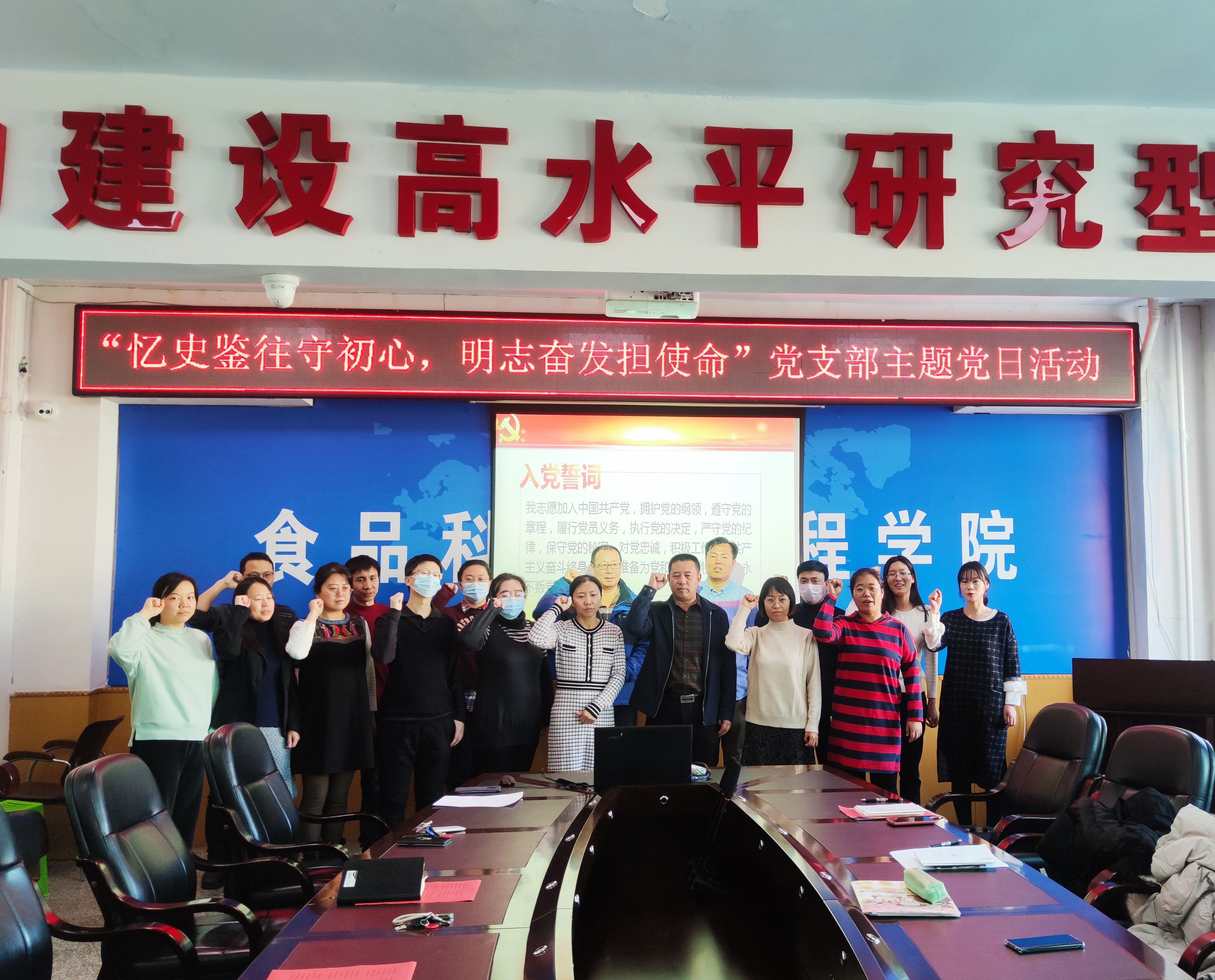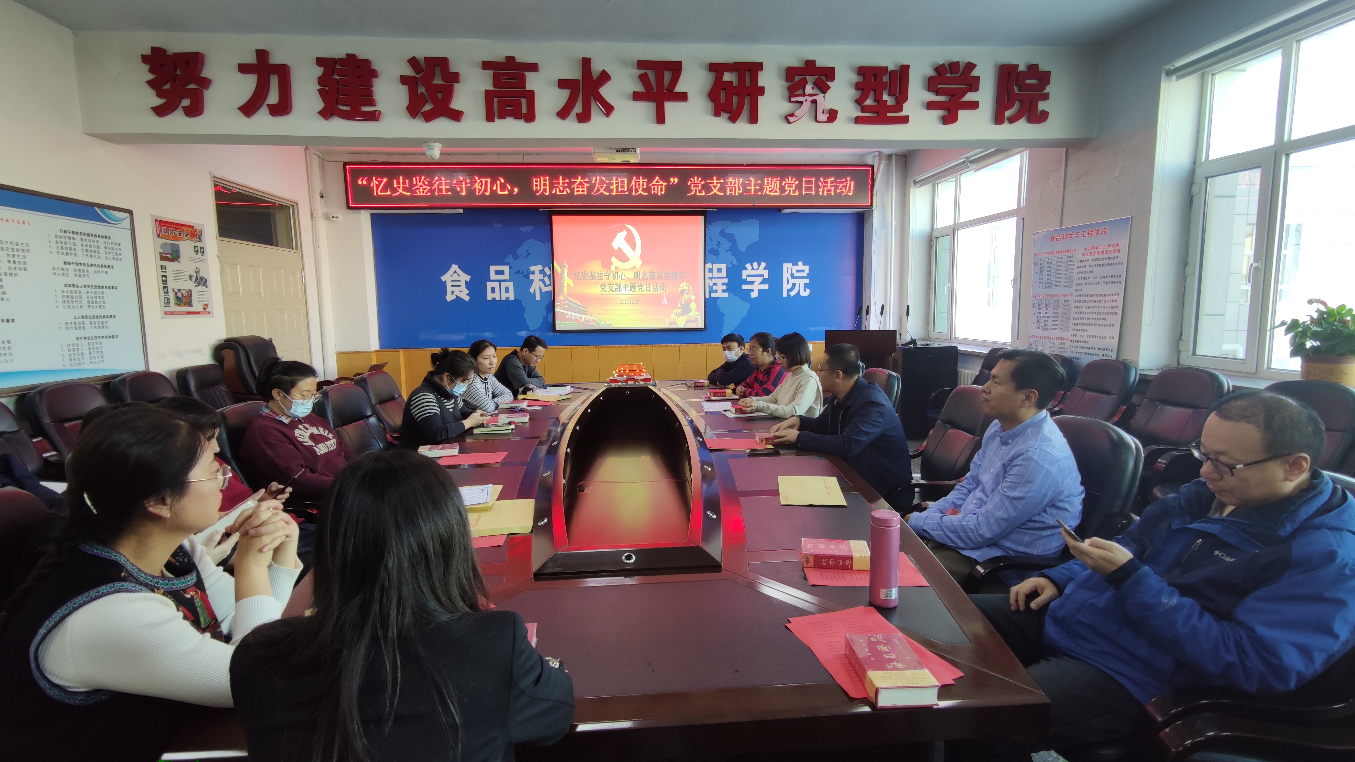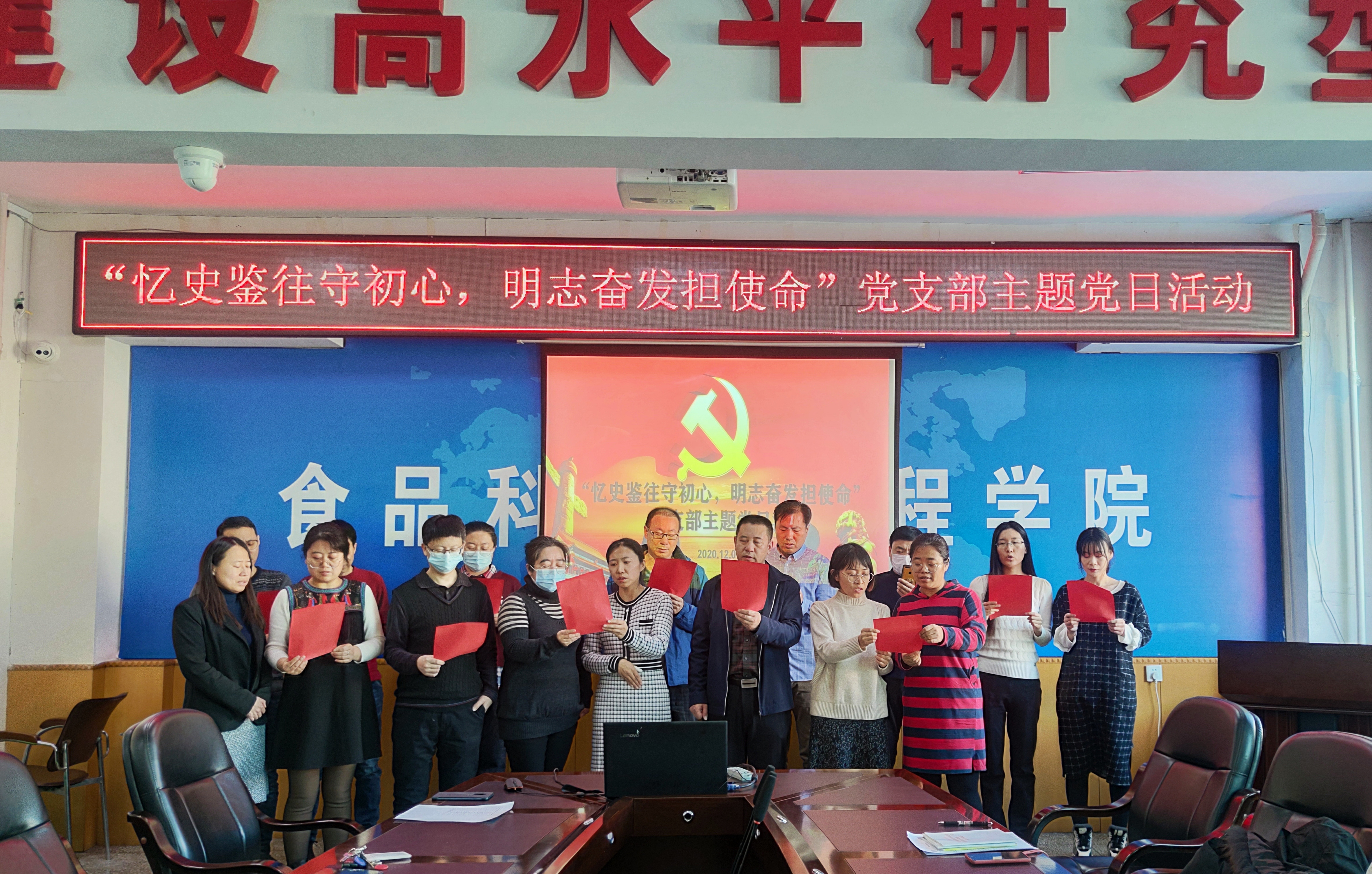 根据“不忘初心、牢记使命”主题教育部署安排,贯彻落实“不忘初心、牢记使命”主题教育精神,2020年12月7日下午,BG大游机关党支部与食品质量与安全系教师党支部在食品楼三楼会议室举办“忆史鉴往守初心,明志奋发担使命”主题党日活动。主题党日活动由公司机关党支部书记马爽同志主持。
