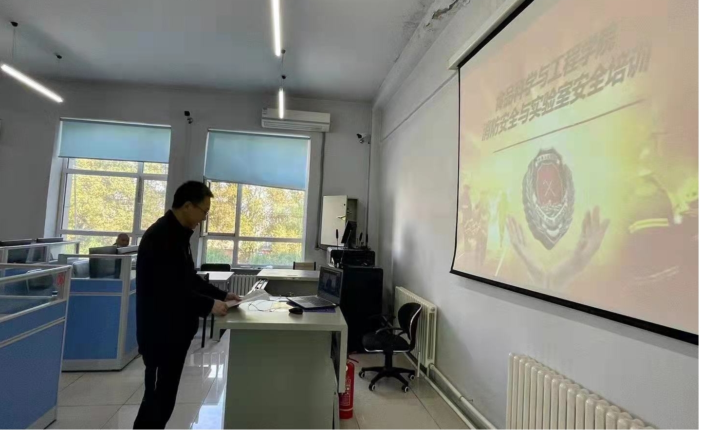会上,保卫处任亚峰老师围绕火灾扑救、灭火器使用、火灾逃生等方面带领同学们学习消防安全,提醒同学们严格遵守相关部门规章制度,提高自防自救能力;食品实验中心王二雷老师从公司实验安全管理体系、检查办法等各个方面详细介绍实验室安全知识,以各大高校实验室安全典型案例警示同学们实验室安全隐患不可小觑。