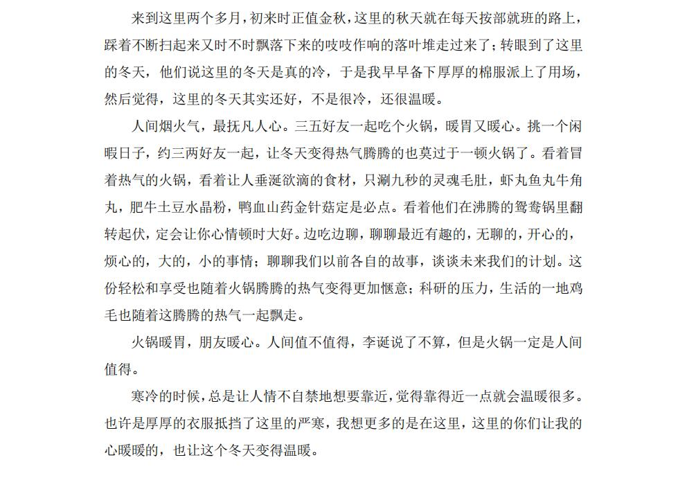 巴金曾说过:“温暖可以使人快乐。”温暖是飘飘洒洒的春雨;温暖是写在脸上的笑影;温暖是义无反顾的响应;温暖是一丝不苟的配合。学习、科研、吃饭、睡觉,日复一日乏味的生活使我们的感情逐渐钝化,当我们试图寻找生活中的温暖,其实温暖就在蓦然回首间。打破尘劳关锁,重拾记忆的碎片,就会发现,温暖是云销雨霁后透出的霞光,是那白鹿青崖间的潇潇暮雨,是寻常巷陌的青石板、烟火气,温暖只轻轻拨动你的心弦,那荡起的涟漪便久久挥之不去,温暖就在你我身边。