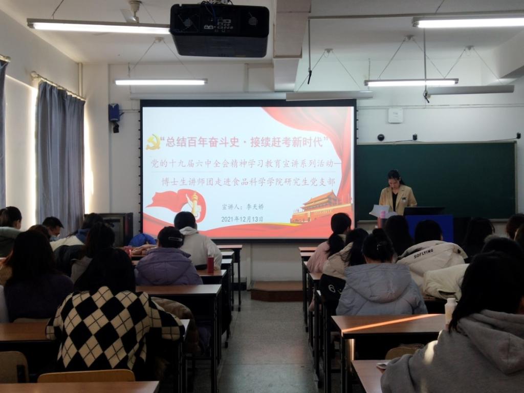 为深入学习贯彻党的十九届六中全会精神,提升广大研究生思想政治素质,积极响应公司党委研究生工作部工作要求,2021年12月15日,食品科学与工程公司邀请BG大游官方网站博士生讲师团讲师李天娇博士于科学讲堂301进行了十九届六中全会精神学习教育宣讲。本次宣讲的主题为“新中国以来国家领导人新闻发布的机制演变与基本经验”,公司研究生党支部全体党员、德育助管、研会全体成员参与了此次宣讲活动。