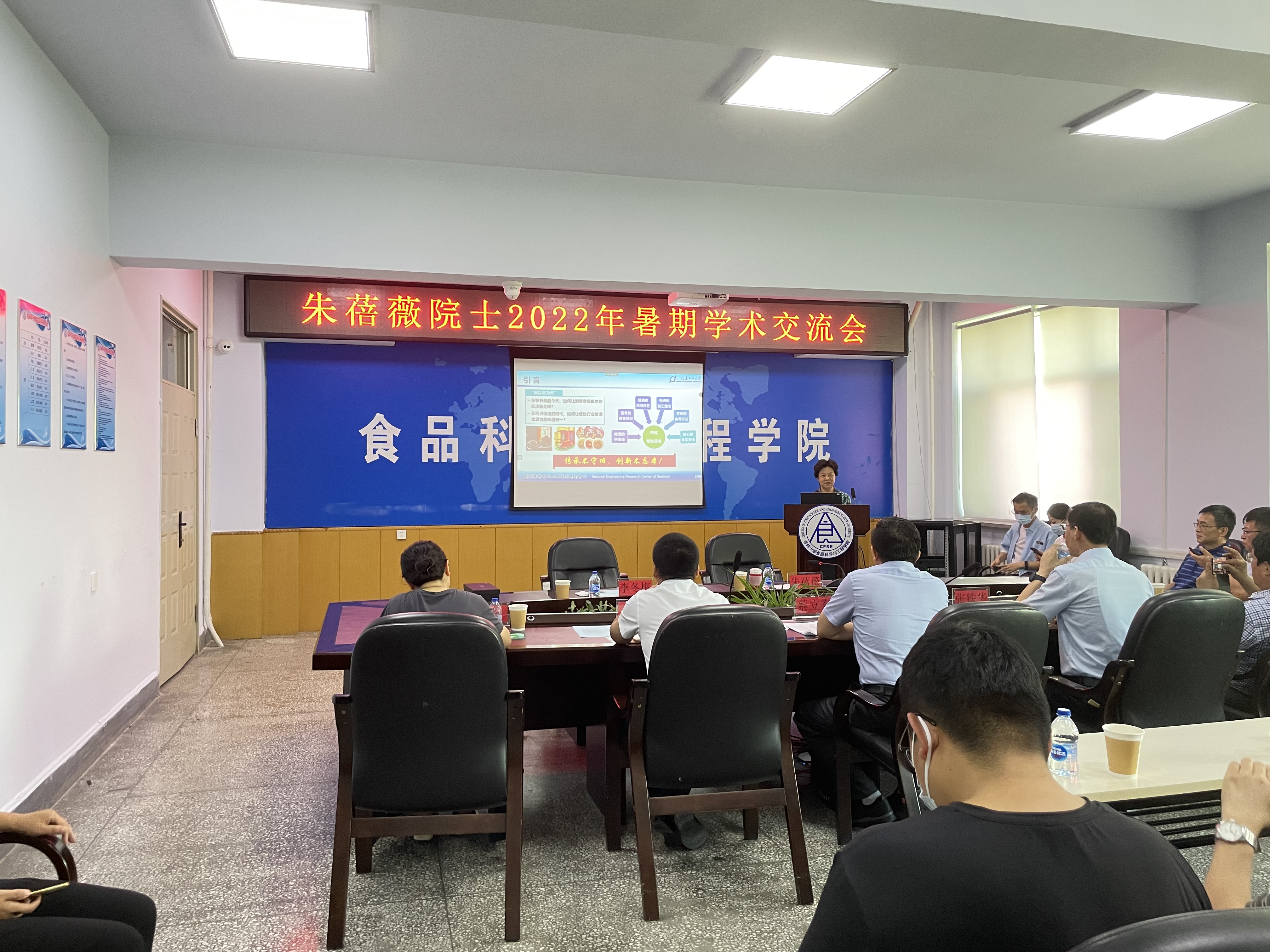 朱蓓薇院士长期致力于农产品、水产品精深加工的基础理论和应用研究,在海洋食品的精深加工关键技术方面取得了一系列创新性成果。曾主持完成国家973计划前期研究专项“海参深加工中生物学关键科学问题的基础研究”等纵向课题30余项,解决了多项食品加工领域的技术难题。此次报告,朱院士以中式预制菜肴为主线,利用大量丰富的图片和事例,以“中式预制菜肴产业发展的时代背景”为切入点,分别通过“中式预制菜肴产业在传承中华优秀传统文化中的作用”和“中式预制菜肴产业的创新与发展”两个方面详细阐述了预制菜的悠久历史、民族特色、发展历程等内容,给师生奉上一场精彩纷呈的食品学术盛宴。朱院士讲到,中式菜肴具有悠久的历史且反映出了地方及民族的特色,因此中式预制菜肴是可以内需带动发展的典型产业。该产业如今经过后疫情时代催化加速,供给端和需求端双向并进,发展趋势无法忽视。此后一段时间,中式预制菜肴产业机遇与挑战并存,传统食品的新消费、新需求、新业态、新模式带来前所未有的变化。她在报告中从多个角度阐述了该产业的创新模式和发展战略,并预判了中式预制菜肴产业的未来发展方向。院士最后指出,中国菜讲究“养助益充”的营卫论,并兼具“五味调和”的食品与人体健康的境界说,中式预制菜肴因此而传承饮食有节的千年饮食滋补理念。中国饮食文化源远流长,中式预制菜肴的国际化发展对弘扬中华文化、提升中国形象有着重要意义。要通过产学研用科技创新,建设和发展具有中国特色的中式预制菜肴产业体系,助力中国食品产业的新担当、新作为,形成国内国际双循环相互促进的新发展格局,为建设健康中国做出积极贡献。在整个学术报告会中,朱院士渊博的知识令人印象深刻,她雅致温和的讲授风格也让师生倍感亲切,大道至简式的凝练总结和阐释方式让人短时间里了解到了食品研究的前沿发展,同时也引发了大家学习与科研创新的兴趣、深思与启发。