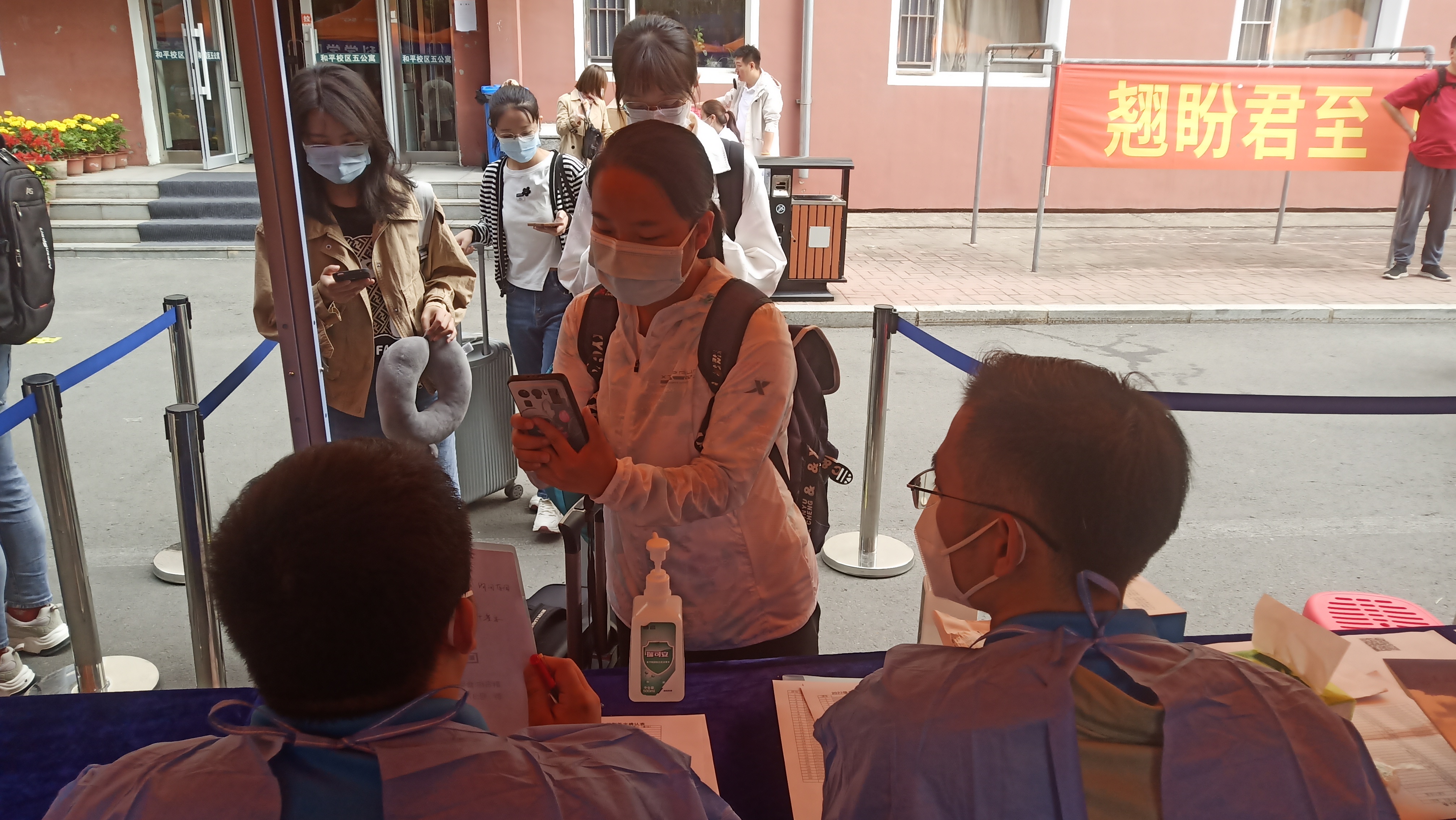 8月24日早七点,迎新工作者们准时到达设立于员工第五公寓前的临时接待站,穿好防护服,戴好N95口罩,开始了忙碌的迎新工作:测温、发放抗疫物资、收集材料,耐心回答新生们的各种问题,为新生们指引宿舍楼的方向。此刻的长春艳阳高照,工作者们防护服内汗流浃背,但耐心依旧,认真负责,帮新生搬运行李、在报到处与宿舍间不断往返以确保迎新生工作的顺利进行。