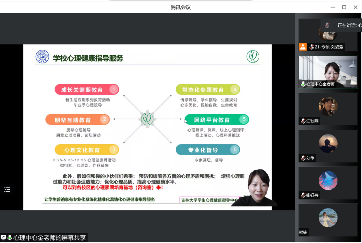 最后,金老师重点介绍了公司的心理健康指导服务,从成长关键期教育、朋辈互助教育直至网络平台教育以及专业化督导,公司拥有一套专业全面的心理健康指导服务系统,助力同学们学会放松,减轻压力,更加轻松愉快地面对生活。