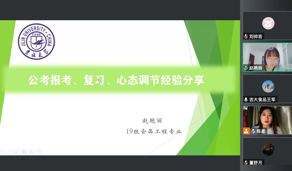 会议开始,董舒月学姐围绕选调生考试备战主题进行了分享,她从巡考经验、备战经历、各省选调生考试重点这三个方面进行了讲解,鼓励应考的同学们加强学习,积极备战。接下来,赵艳丽学姐围绕选调生的备考方式、笔试经验、面试感受、体检注意事项、政审要求等全方面进行讲解,并建议同学们要积极备战,调整心态状态,始终勤学善思,不断努力提升自身素质。最后,王雪松学长分享了择业的心路历程和体会,他从就业方向选择、工作经历体会两个方面进行了全面认真的总结,王雪松学长结合自己的工作经历,强调了在求职中一定要勇敢尝试,深入理解所应聘岗位的特性和要求,做足准备,并及时复盘学习,在一次次面试中积累经验。