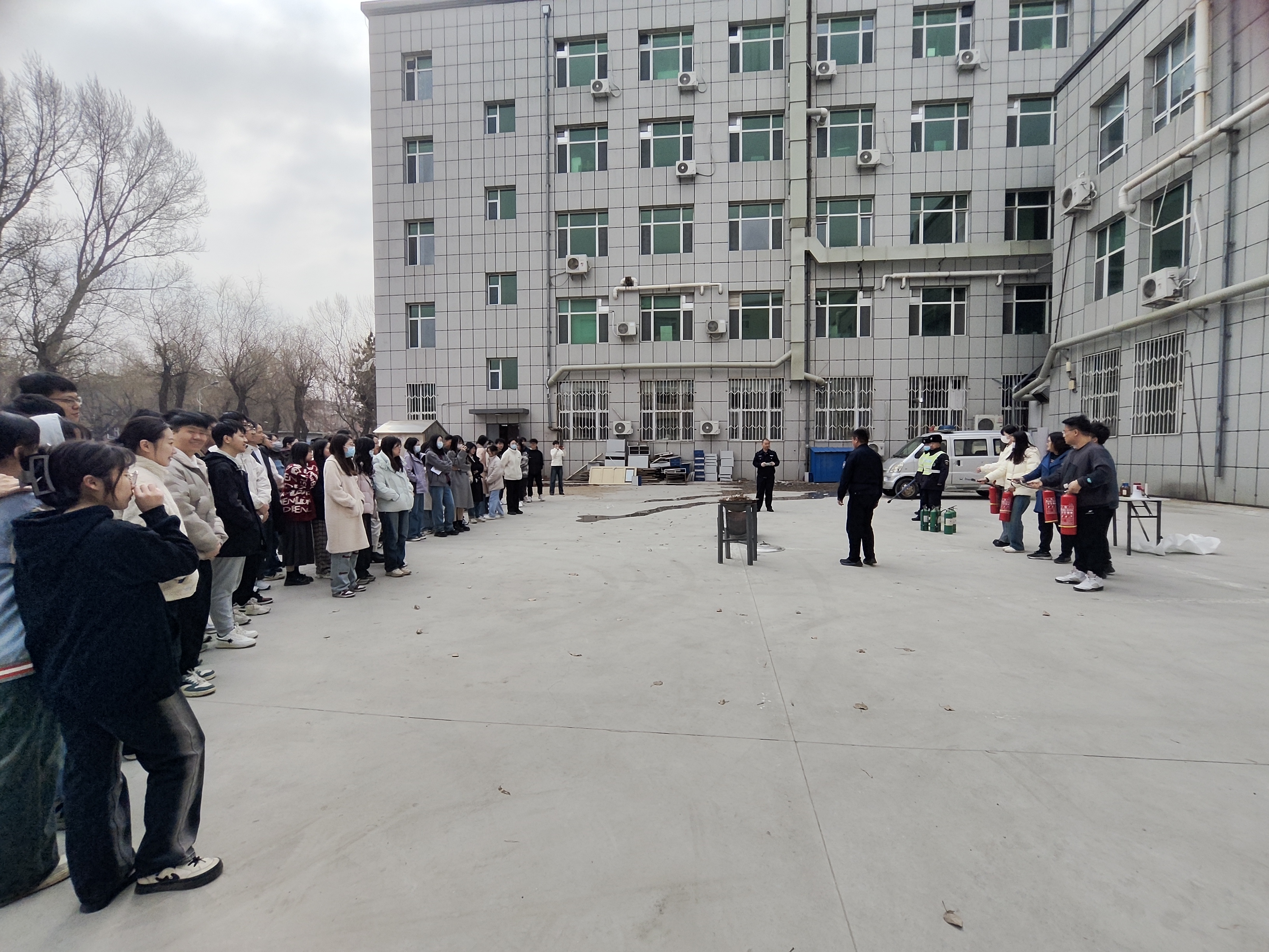 随后,组织开展了消防安全疏散逃生及消防灭火演练活动。火灾警铃响起,公司师生在保卫处老师们的指导下按照应急疏散安全路线快速撤离。西区保卫办任亚峰老师对火灾初期的扑救、控制及灭火器使用等进行了详细讲解。