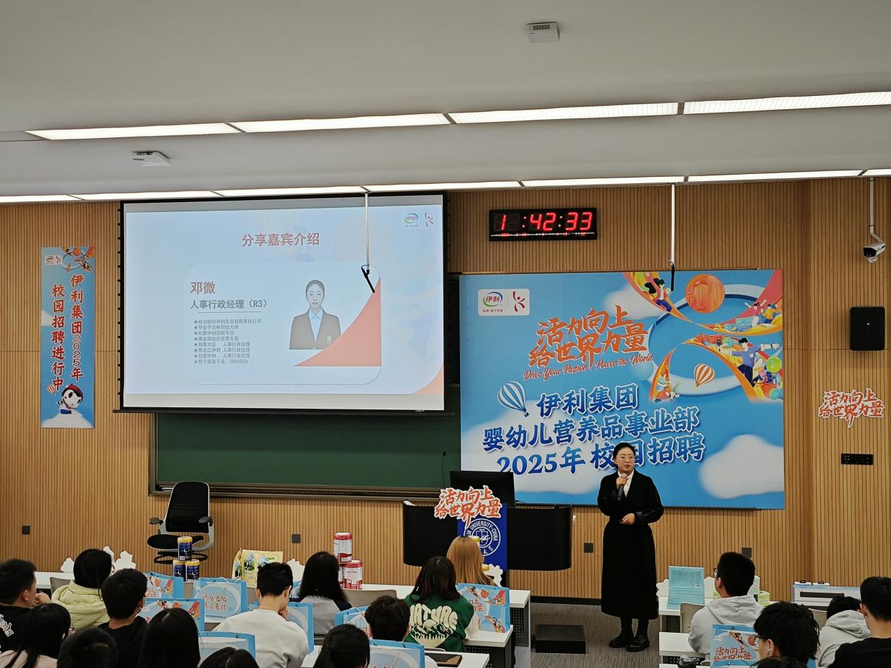 招聘宣讲会上,杨静讲述了从一名“吉大学子”到一名“伊利人”的成长故事,并结合企业实力、福利体系与用人标准三大板块内容,介绍了伊利集团的全球化战略、社会责任实践和行业竞争优势。针对员工关心的职业发展路径,重点介绍了薪酬福利、“三年专项培训体系”等职场人成长机制。