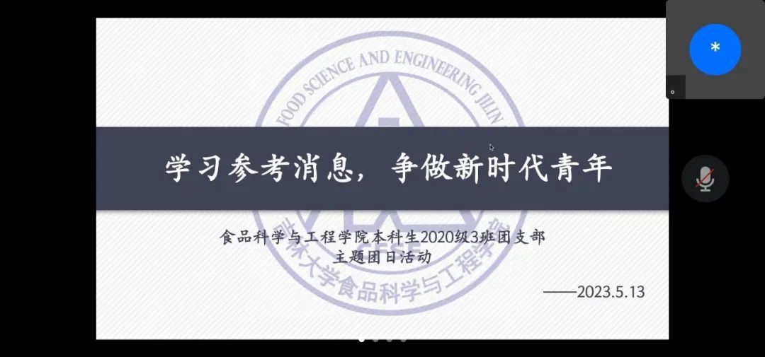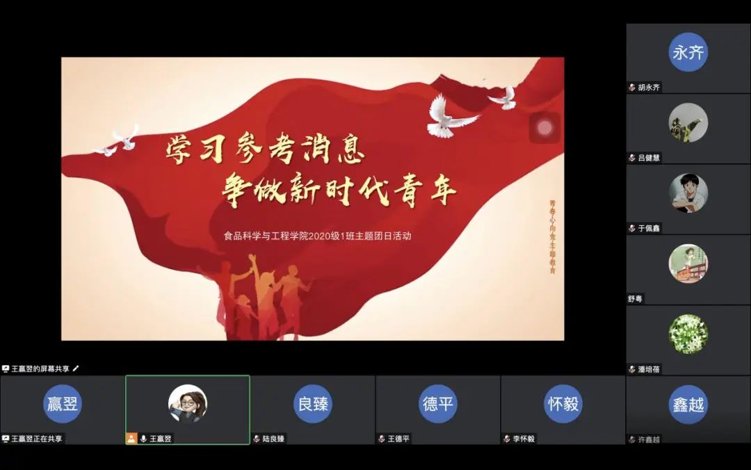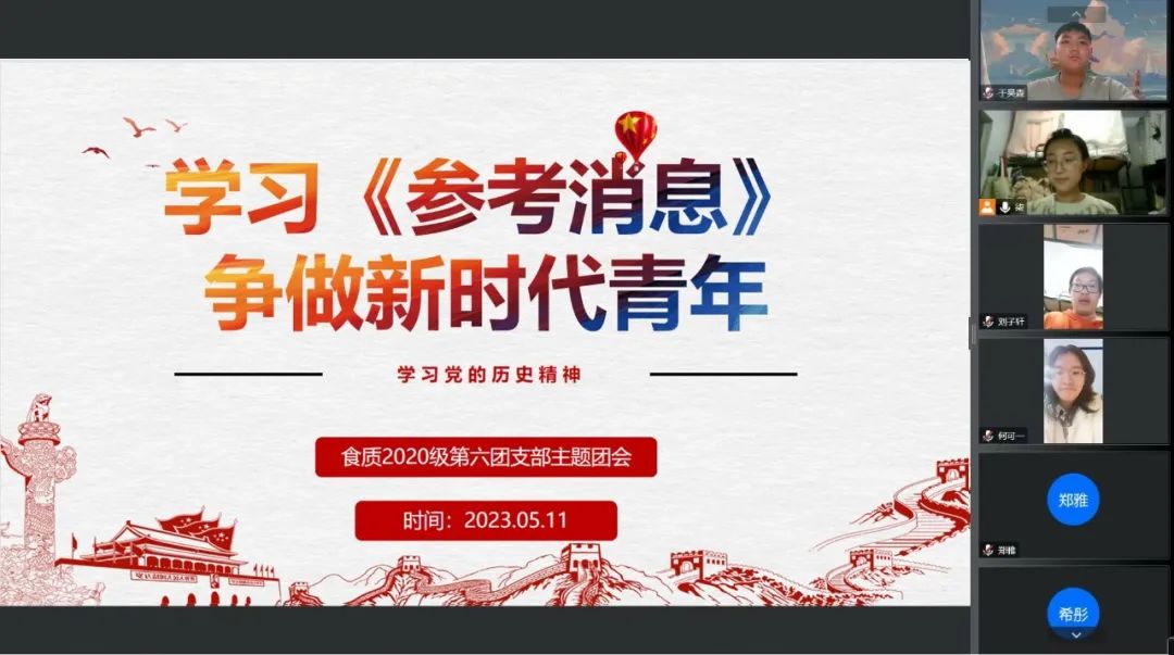 为了深入学习宣传贯彻全国两会精神,引导班级团员深刻领会、准确把握两会精神实质,2023年5月8日19时,BG大游2020级食科第二团支部通过腾讯会议开展“学习《参考消息》,争做新时代青年”主题团日活动。2020级食科二班全体团员参加,本次活动由团支书组织开展。通过这次此次团日活动学习,同学们的思想政治觉悟得到了进一步的提高。