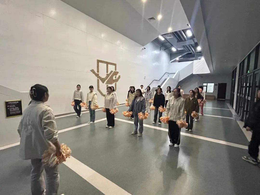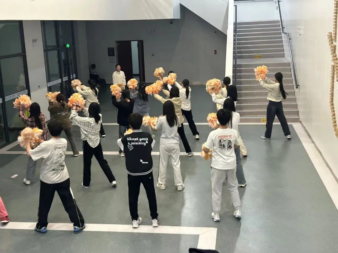 在训练场里,只见同学们一个个精神抖擞,拿着统一的花球,在负责人陈天航,裴映绮同学的激励下,认真地练习着每一个动作,从基础的动作练习开始,抬腿、挥手、跳跃,每一个动作都要经过无数次的重复与雕琢,只为做到最标准、最有力。