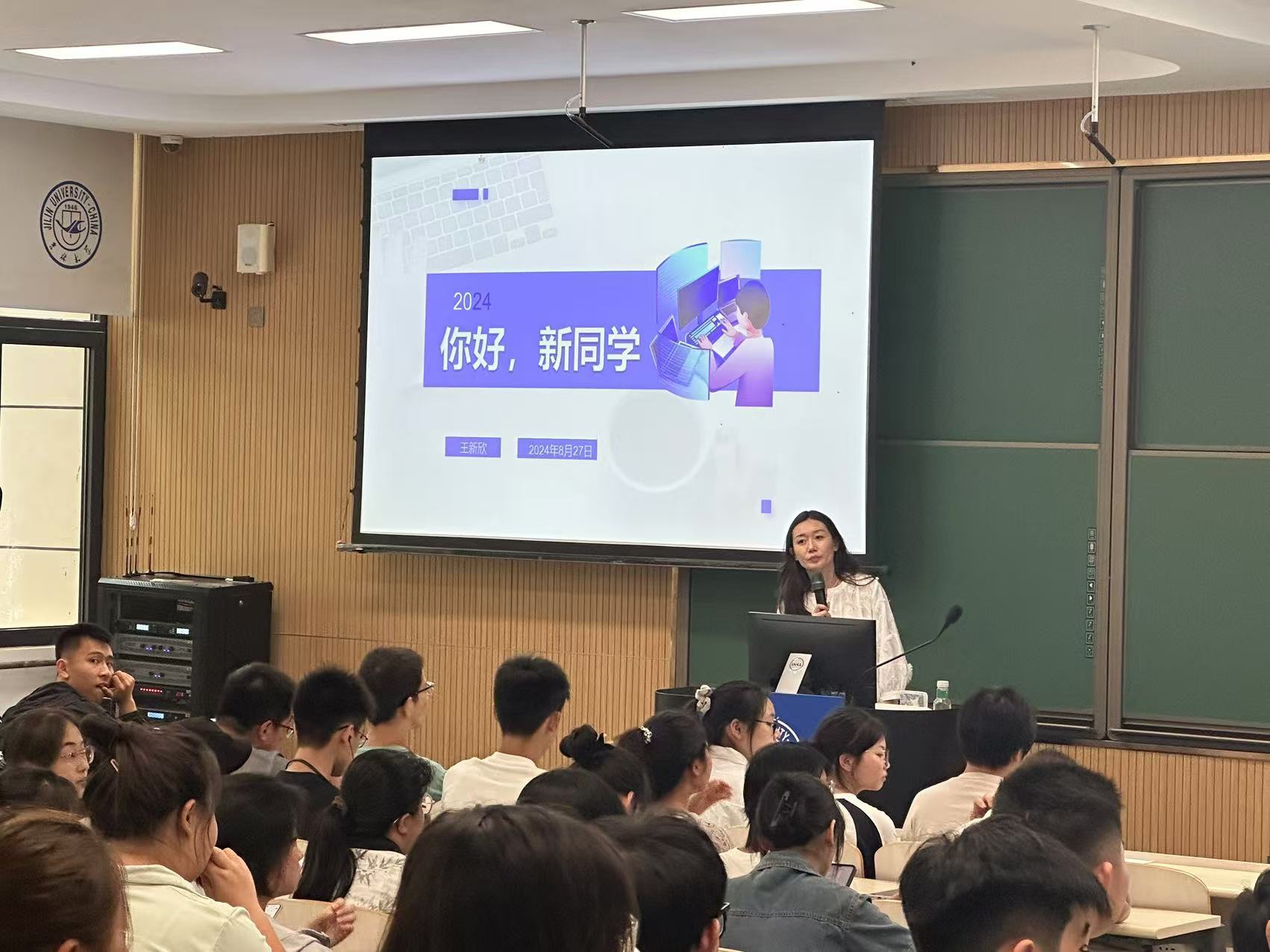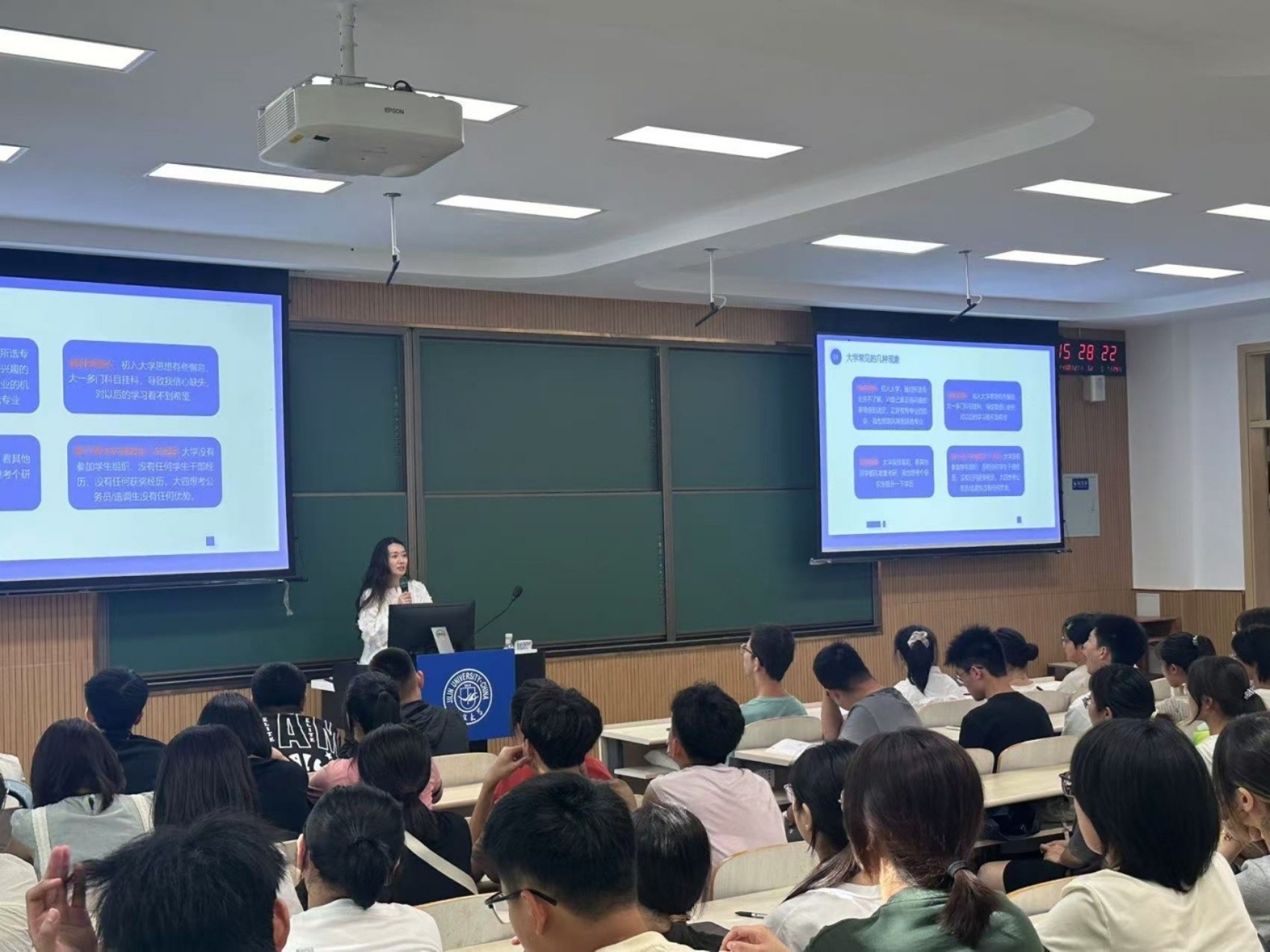 在学习方面,王新欣老师指出了大学常见的几种现象,提醒各位同学在大学要平衡好学习和生活,不要挂科,不要盲目考研,不要使自己的大学经历一片空白,要多多参与活动来丰富自己的人生阅历,提升个人能力。同时,王老师也向同学们介绍了2024届毕业生的保研率和直博率,这也深深鼓舞了各位新同学。