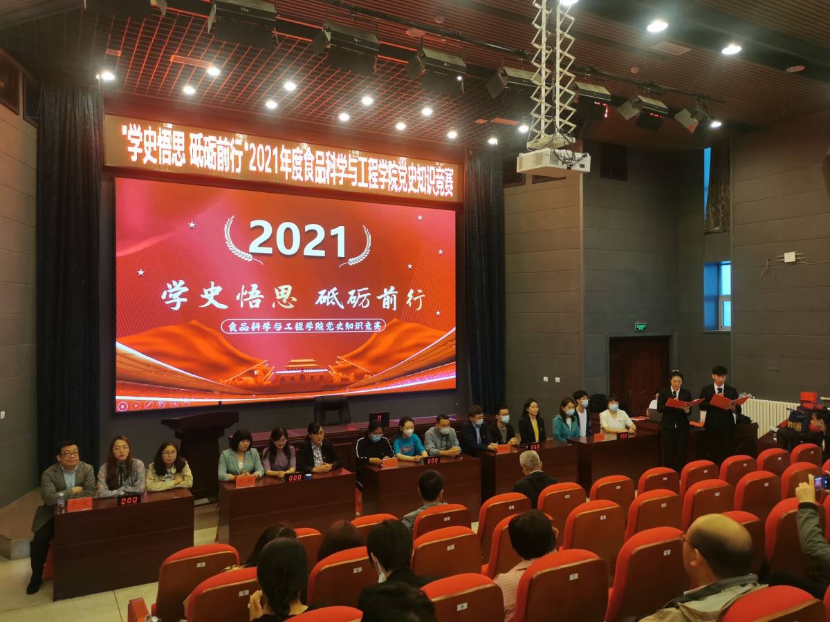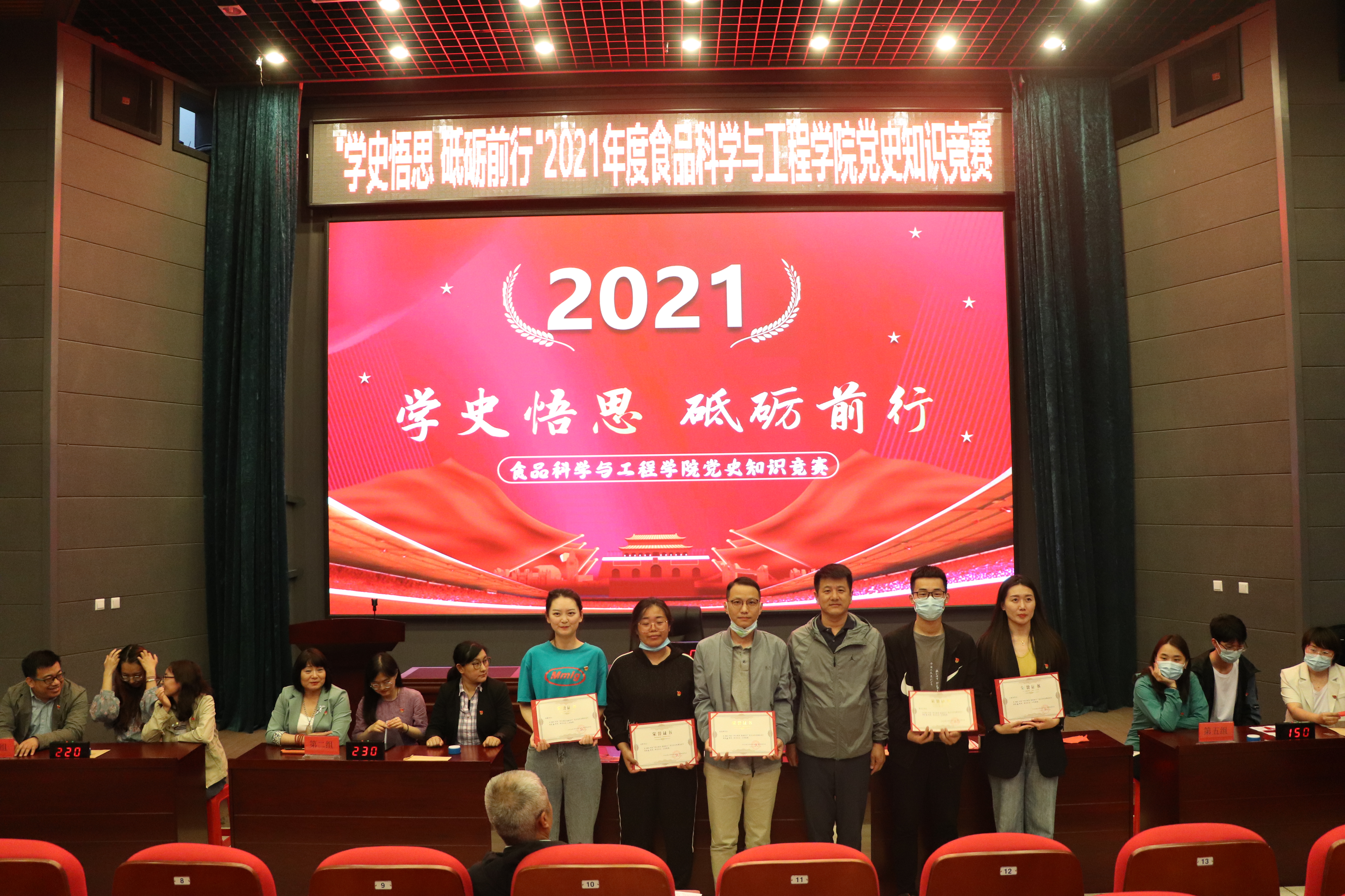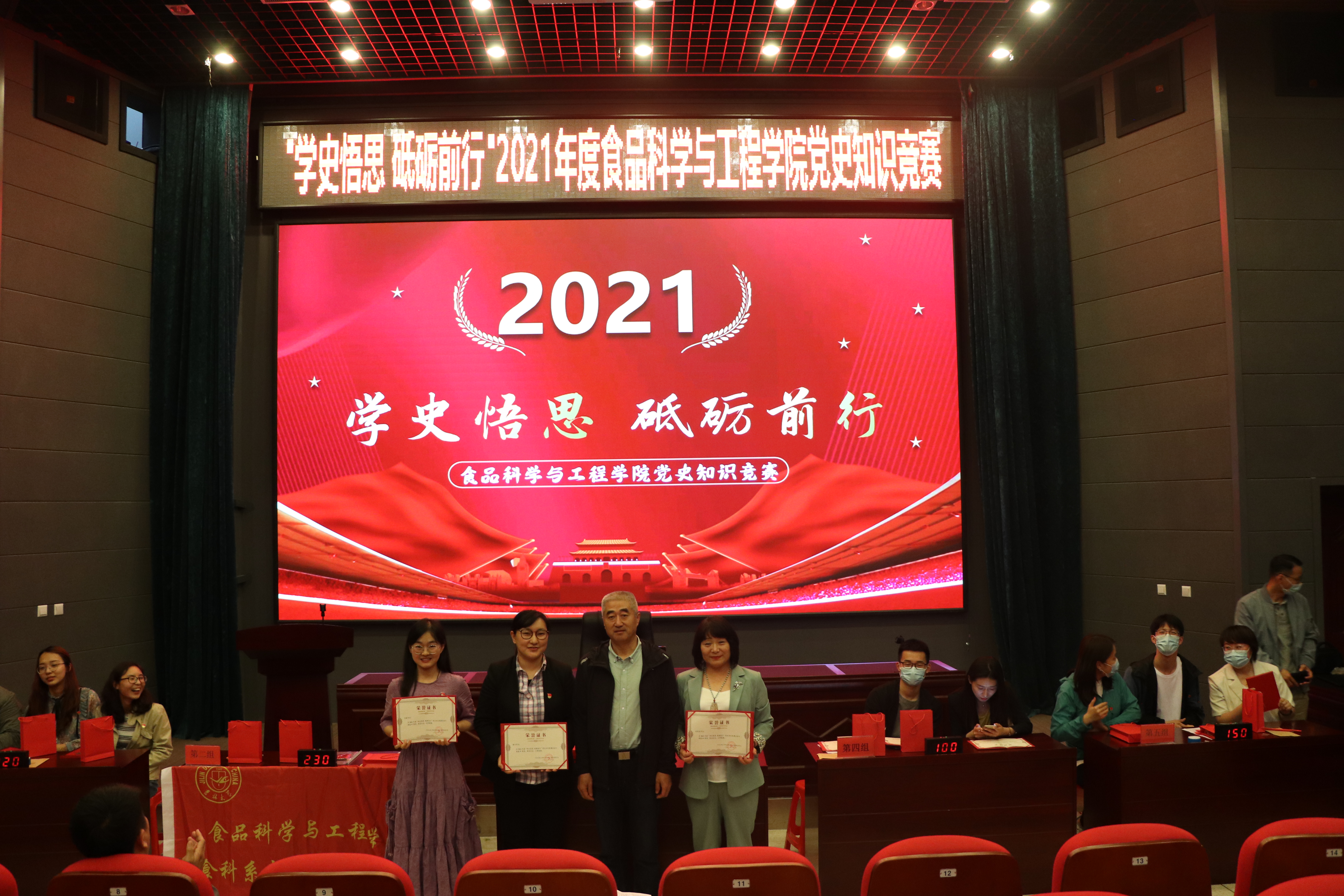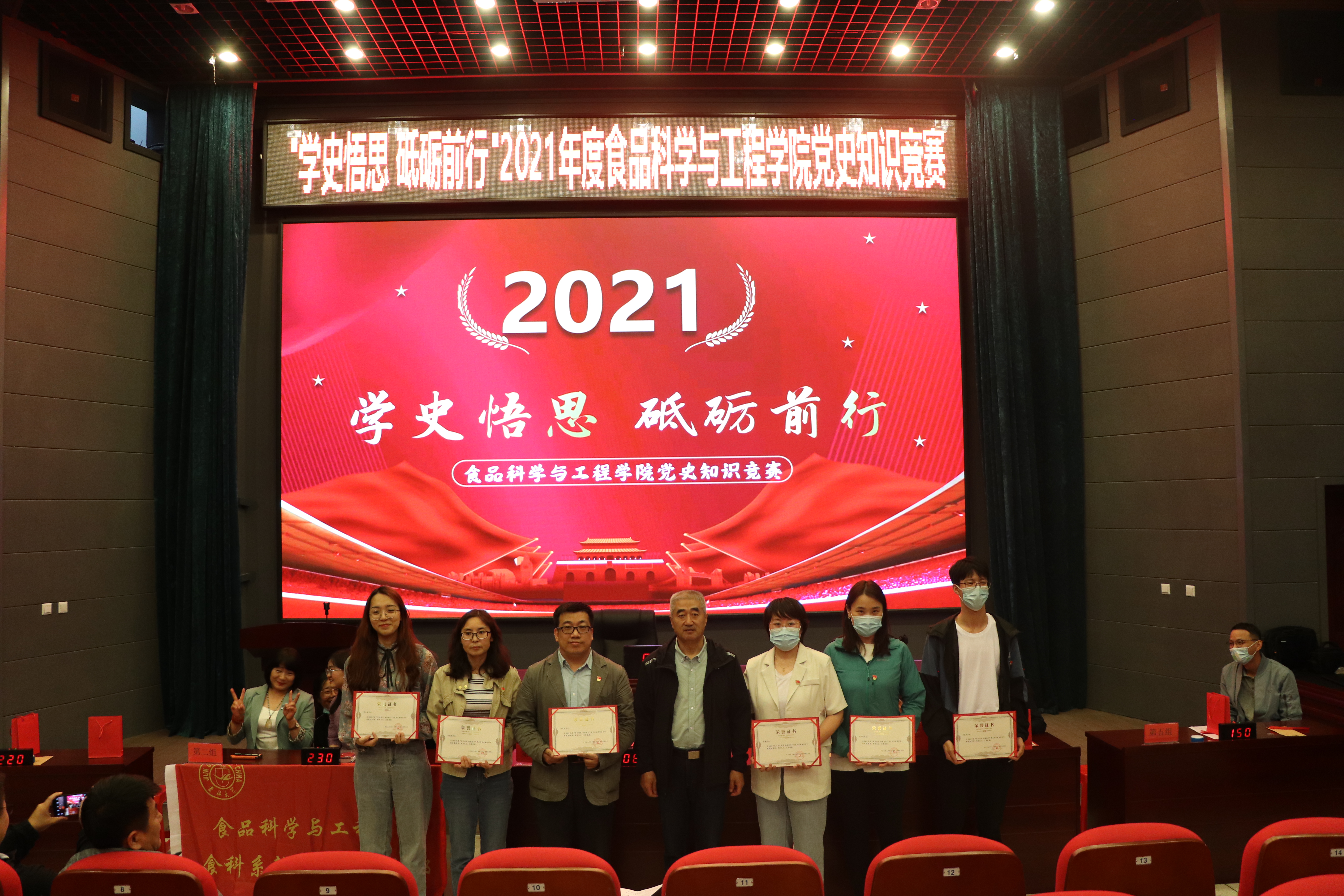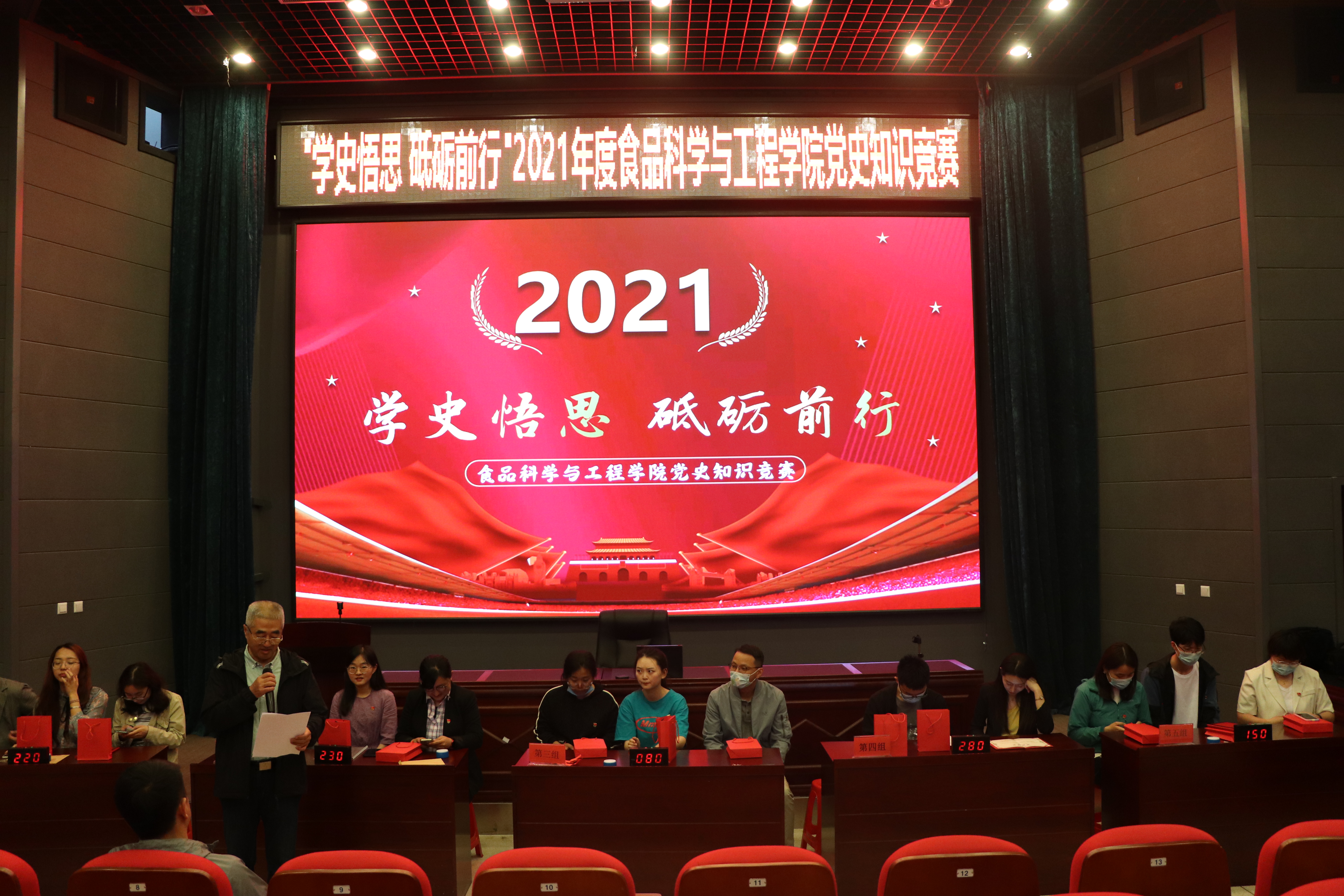 本次“学史悟思 砥砺前行”党史知识竞赛由公司师生党员联合组成五支代表队参赛,知识竞赛有必答题、抢答题、风险题等环节,涵盖《中国共产党章程》《党的十九大报告》、党建知识应知应会100题等党史相关内容。主持人宣布竞赛开始后,全体师生党员齐唱《中华人民共和国国歌》,比赛帷幕就此拉开。比赛中,选手们精神饱满,积极踊跃,沉着应答,展现出丰富的党史知识储备。在抢答题环节,各参赛队选手争分夺秒,精彩迭出,赢得了一阵阵热烈的掌声。比赛现场气氛热烈、紧张有序、扣人心弦,经过激烈角逐,食品科学与工程系第二教师党支部代表队荣获一等奖,食品科学与工程系第一教师党支部和实验教学中心党支部代表队荣获二等奖,食品质量与安全系教师党支部和机关党支部代表队荣获三等奖。